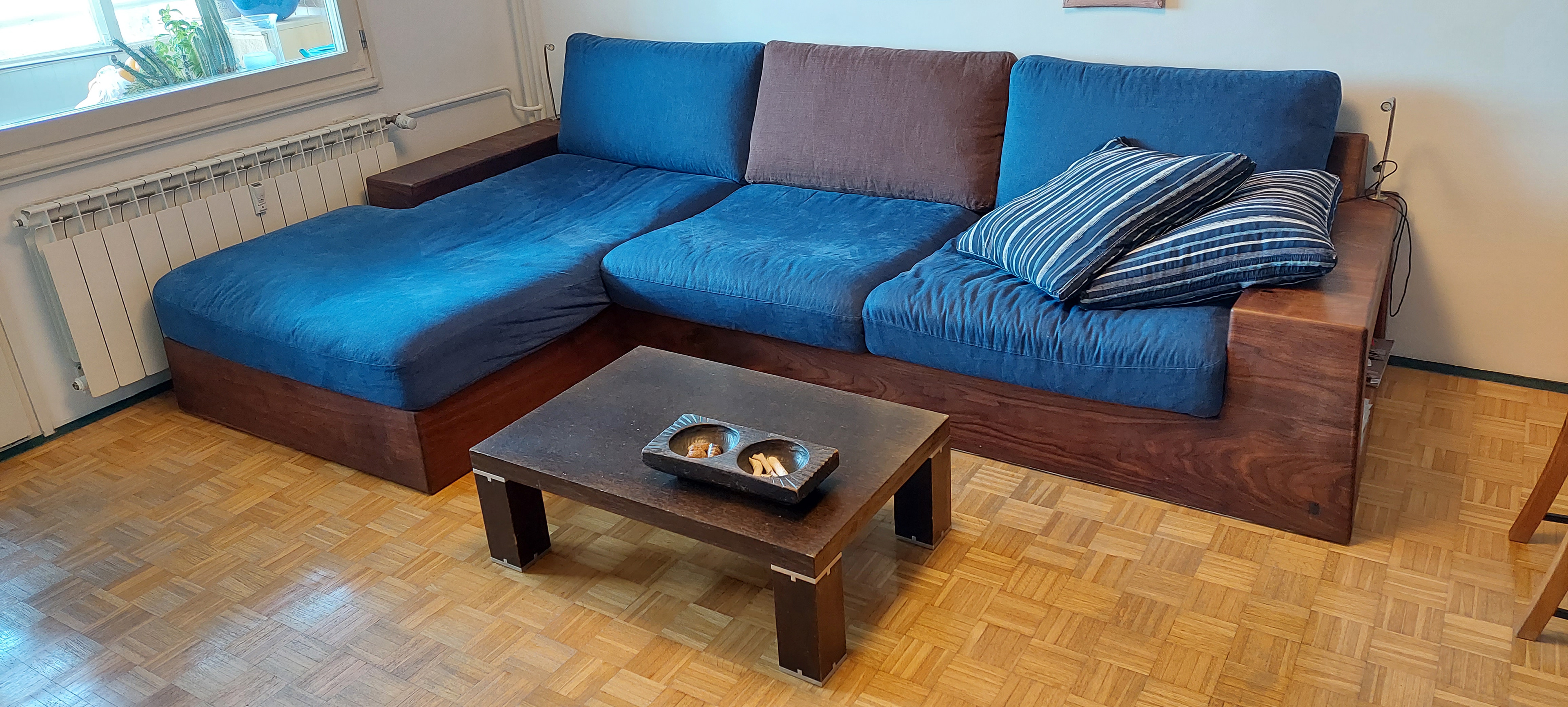 Kavc iz masivnega oreha z dvema luckama in dvojnimi elektro in usb prikljucki, aja, nobena stranica ni pravokotna, vse je pod kotom, blazine pa so 7-slojne.