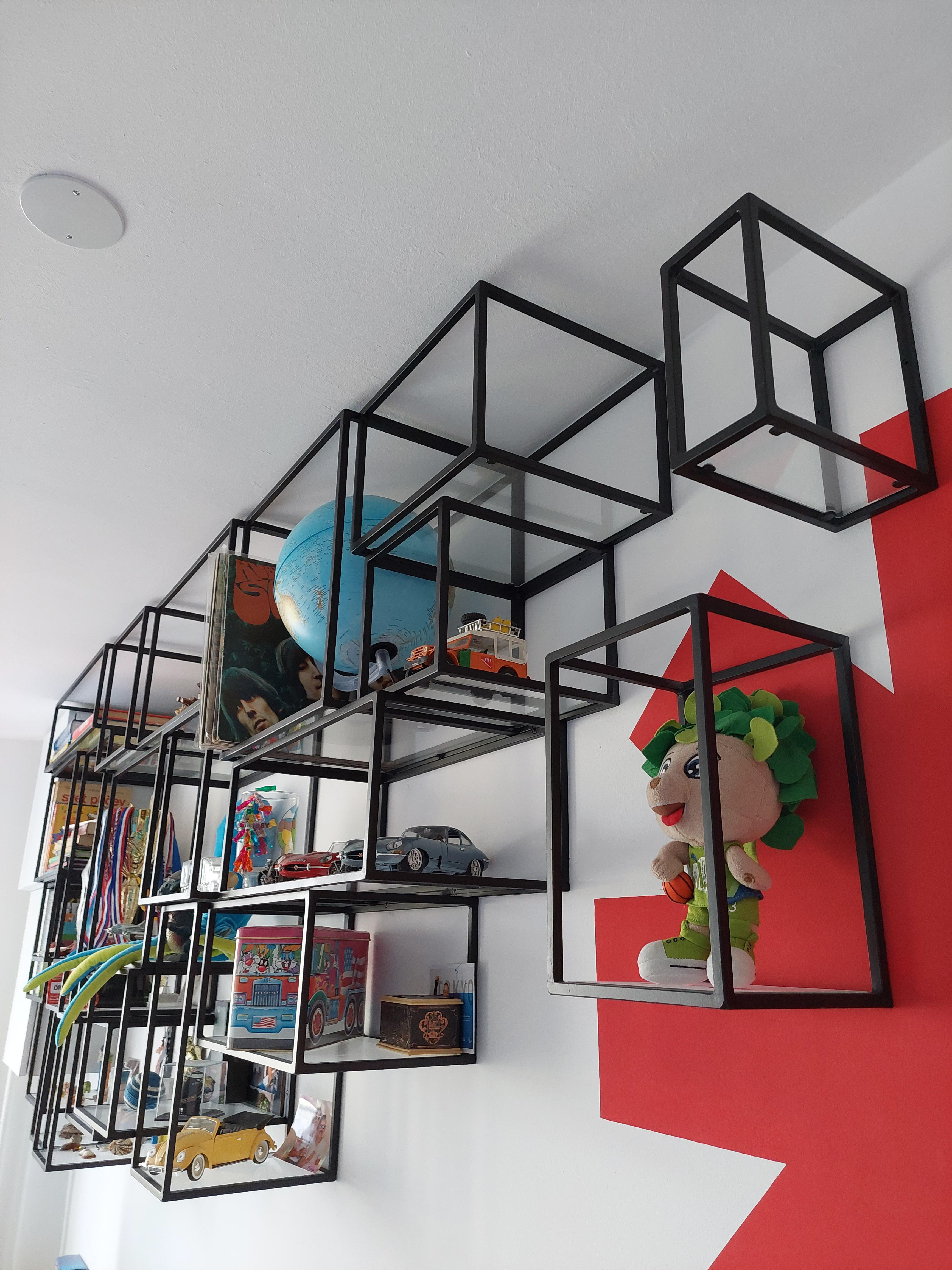 Knjižne police, 23 različnih kvadrov iz železa s steklenimi policami.